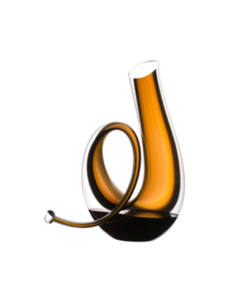 - Bình chiết rượu vang Riedel Decanter RQ Horn được thiết kế theo hình dáng của chiếc kèn đồng Cor, biểu tưởng truyền thống gắn liền với di sản của gia đình Riedel ở Áo và Bohemia. Đồng thời, Horn được lấy cảm hứng từ biểu tượng của hệ thống chuyển phát thư tín nước Áo (Austrian Post’s). Giống nhiều loại Decanter có dáng cong của Riedel, Horn có 2 đầu thông nhau giúp tăng tốc độ sục khí của Rượu vang. Đối với Horn trong quá trình thổi cần tới 3 người thợ chính để tạo ra tác phẩm nghệ thuật độc đáo này. Màu pha lê trong suốt của Horn được tạo điểm nhấn bằng dải màu vàng ở giữa và 2 dải đen bên cạnh trải theo đường cong của bình, đem lại một tổng thể sang trọng bậc nhất.