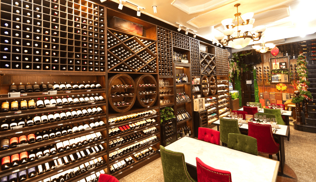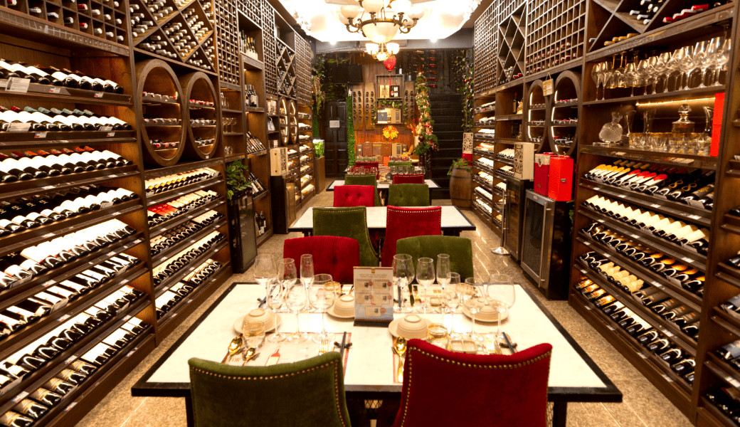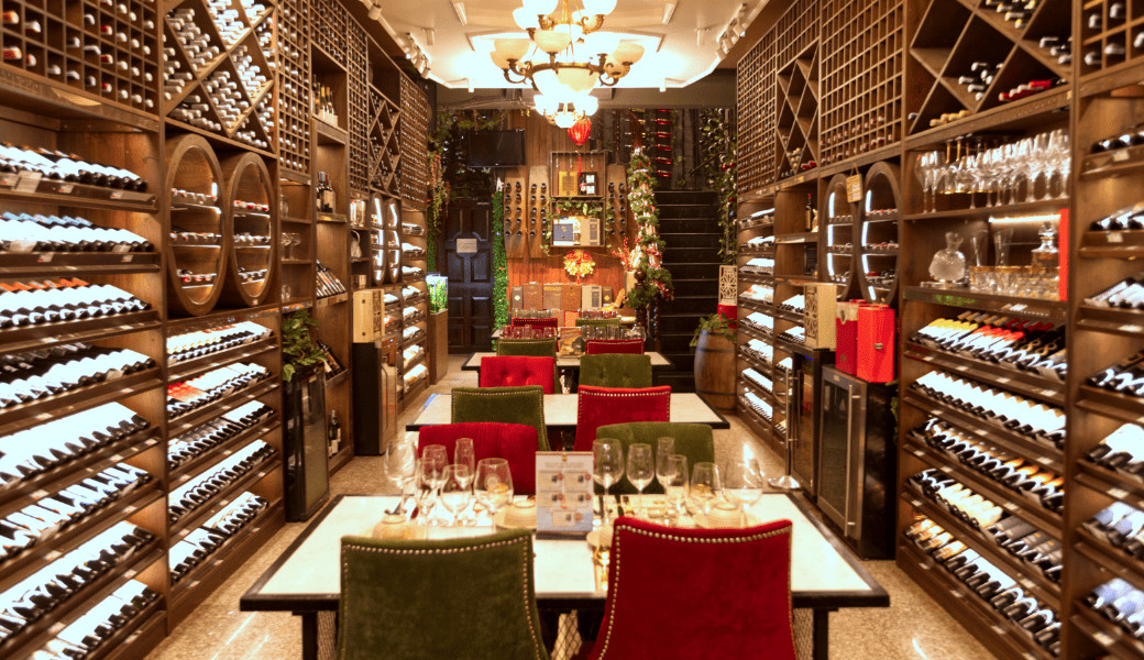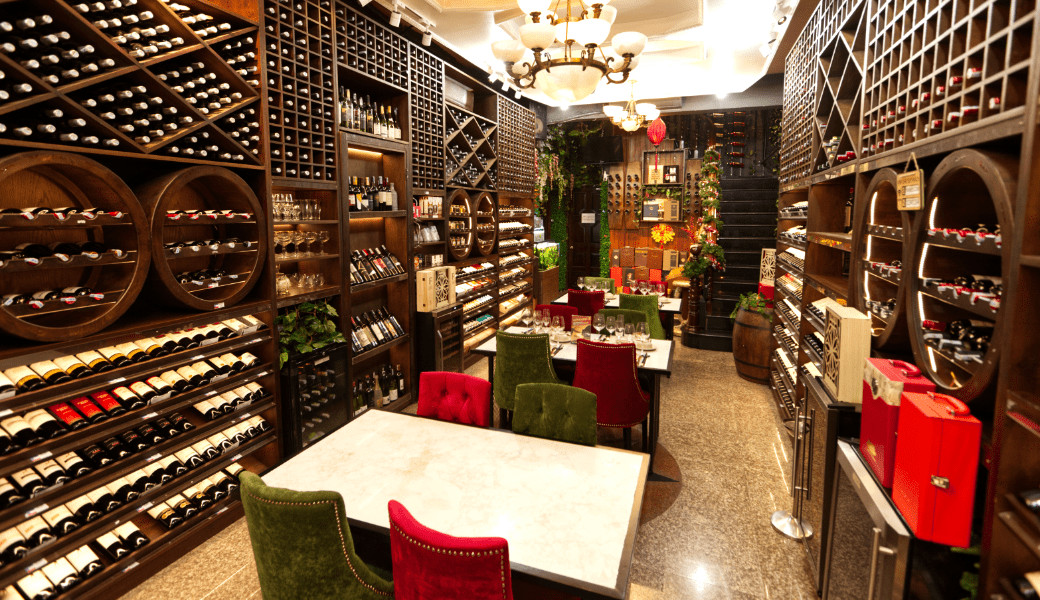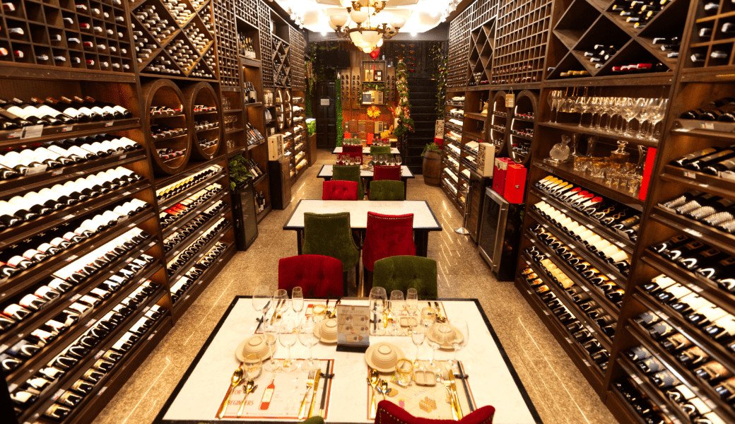 Toa sảnh chính có hơn 400 dòng rượu bia các loại đến từ các quốc gia: Pháp, Ý, Mỹ, Chile, Tây Ban Nha, Úc,....
