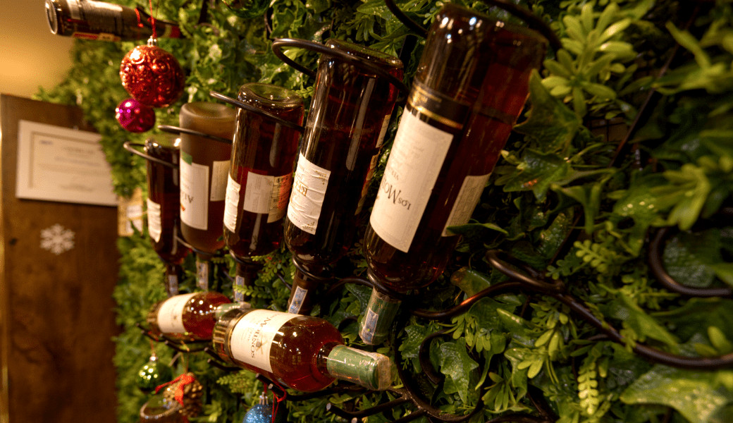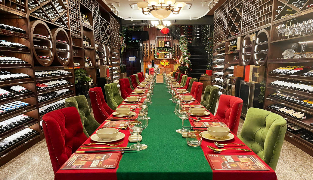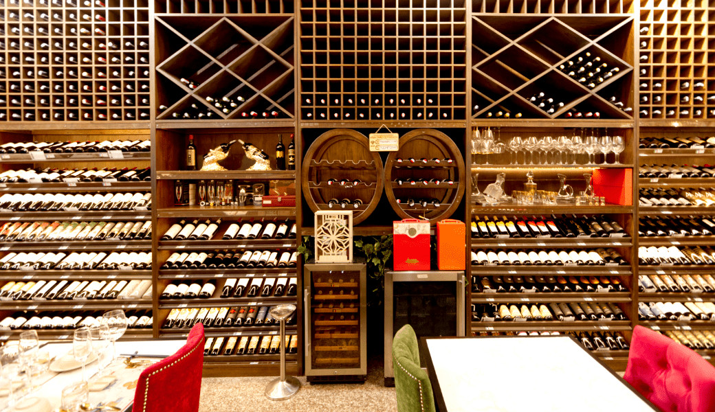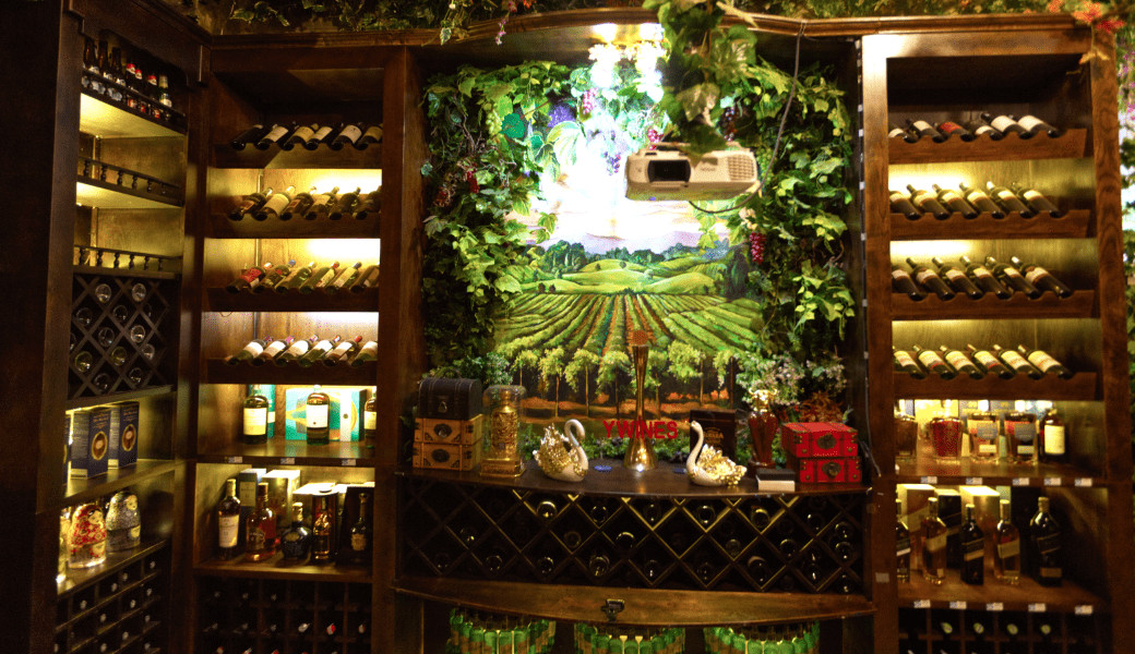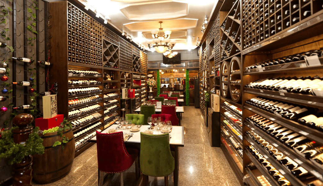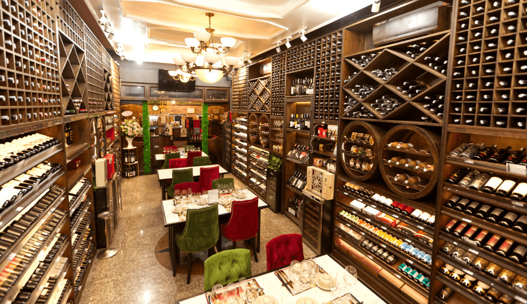 Toa sảnh chính có hơn 400 dòng rượu bia các loại đến từ các quốc gia: Pháp, Ý, Mỹ, Chile, Tây Ban Nha, Úc,....